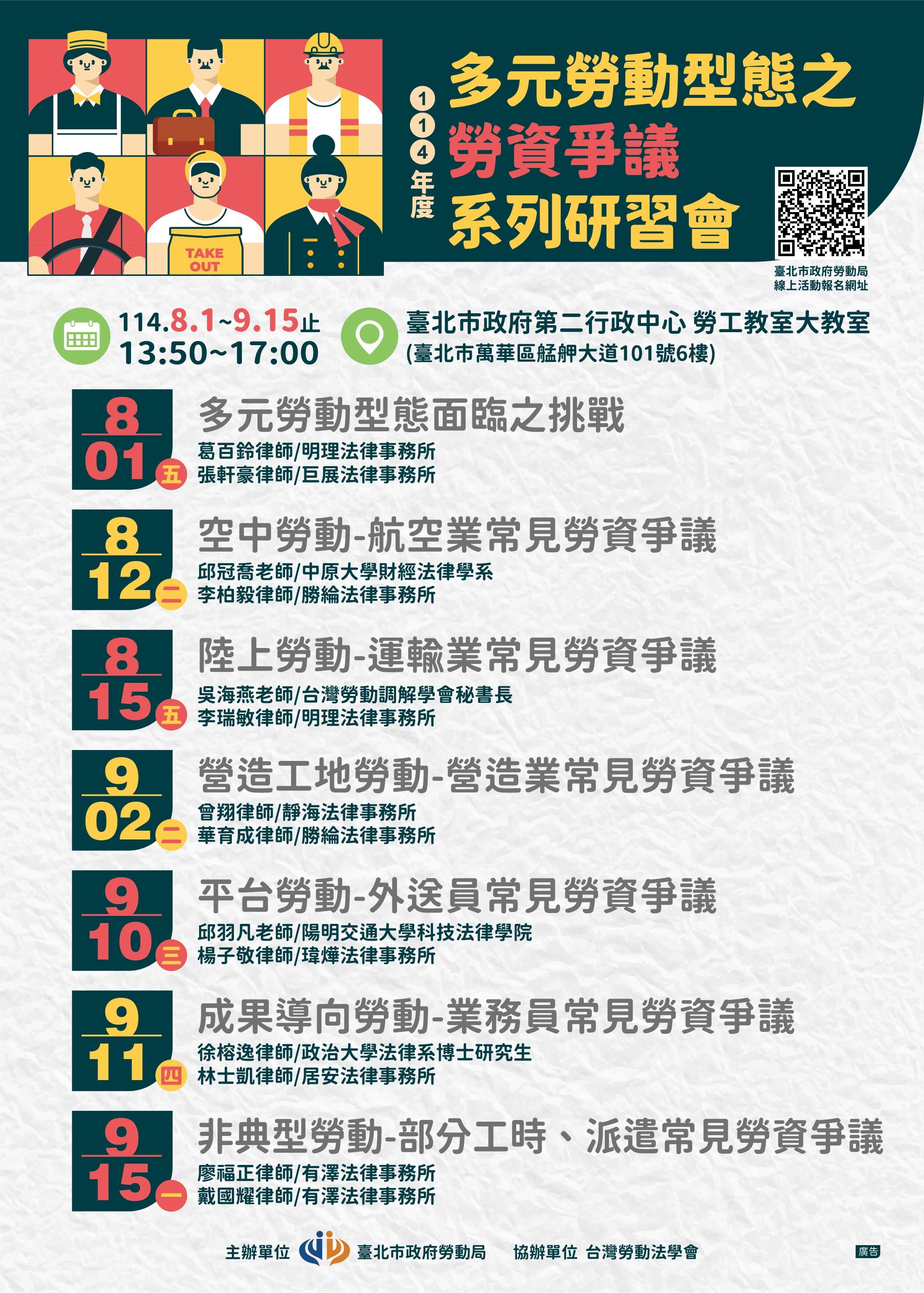 臺北市政府勞動局與台灣勞動法學會合作,辦理勞動法令研習會,由台灣勞動法學會邀請熟稔勞動法爭議與實務案例之學者專家及律師擔任講座,並以各行業勞動型態及其勞資爭議為主軸,規劃辦理「多元勞動型態之勞資爭議」系列研習會,共計7場次。