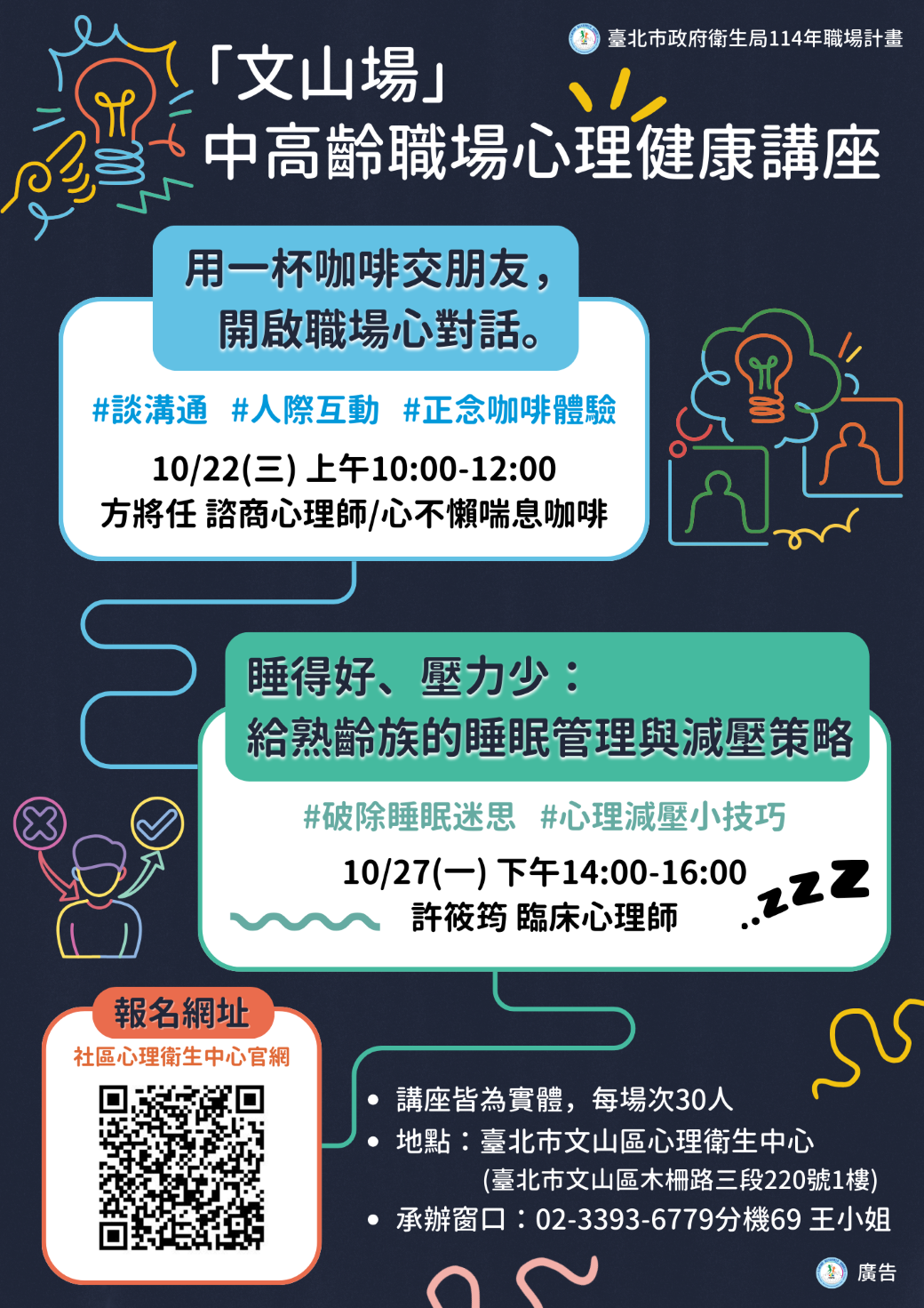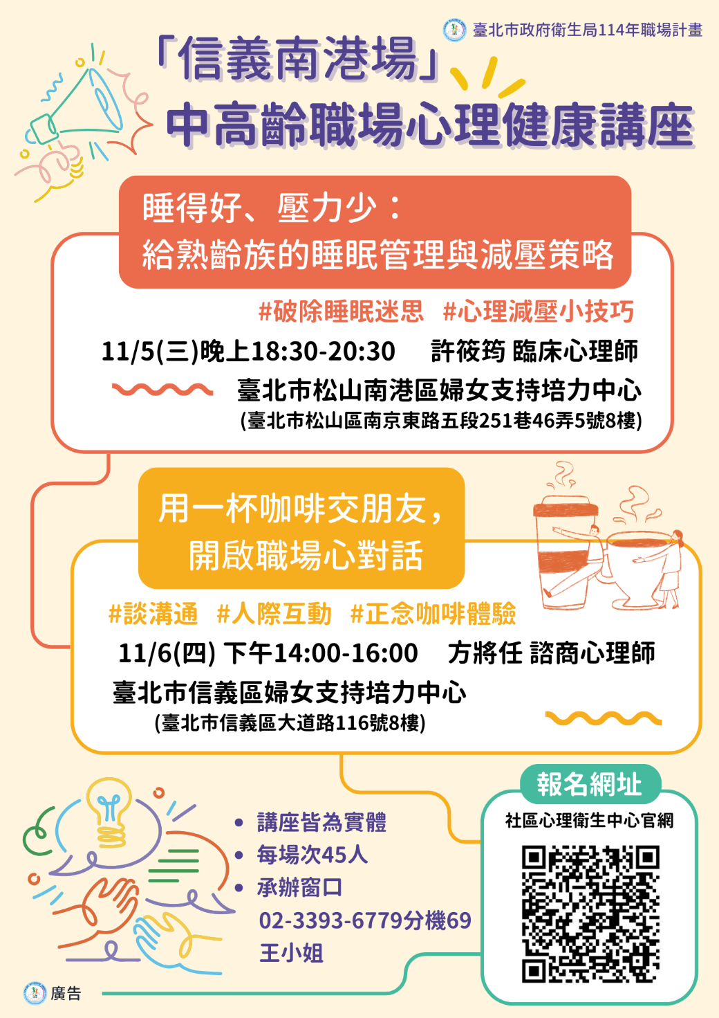 臺北市衛生局社區心理衛生中心特別規劃「職場中高齡講座」,講座資訊如下: